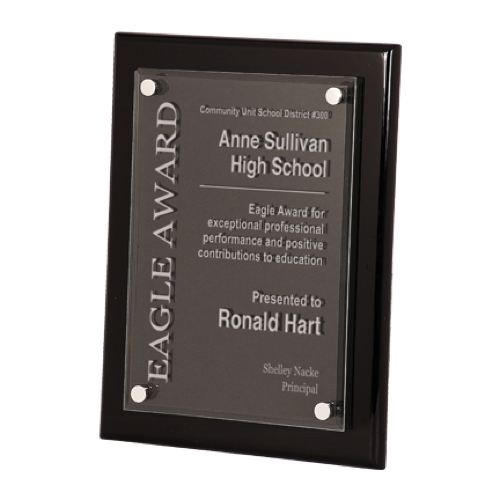 Black piano finish floating acrylic plaque.